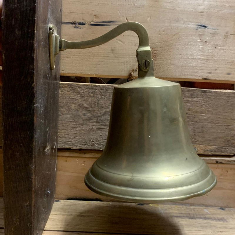 Brass Bell with Teak Mount. 6" Diameter, and 6" High including Bracket.